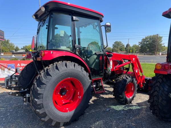Brand new TYM 4x4 cab utility tractor with front loader. 55 horsepower 4 cylinder TYM turbo diesel. TYM diesel motors meet Tier 4 emissions standards without a computer!!! NO computer!!!. Hydrostatic transmission with auto throttle keeping the engine RPM at optimum output. Power steering, cruise control, full size cat II three point hitch with pull out arms and rear 3 point controls to make it easier to connect implements. Dual set of rear hydraulics standard, triple set optional. 540 rpm rear PTO with drawbar. Flat deck operator station with suspension seat. This tractor is fully loaded with heat, air conditioning, stereo.