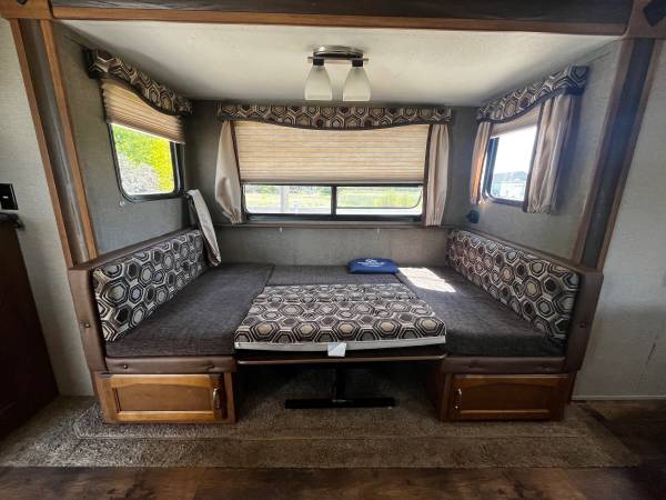This model has the horseshoe shape dinette that is 7 ft 2 long and a Murphy’s bed that makes into a full queen bed.
